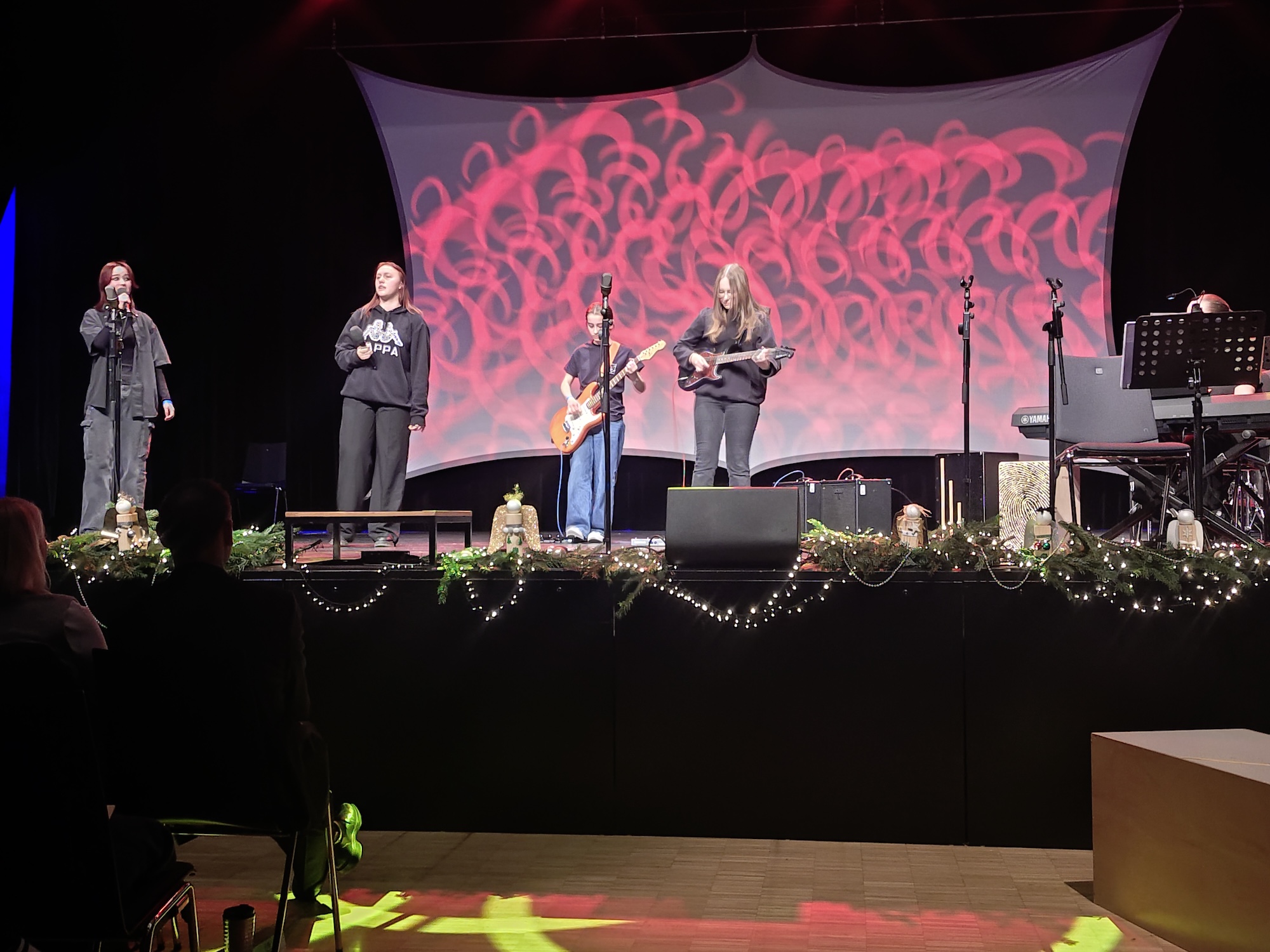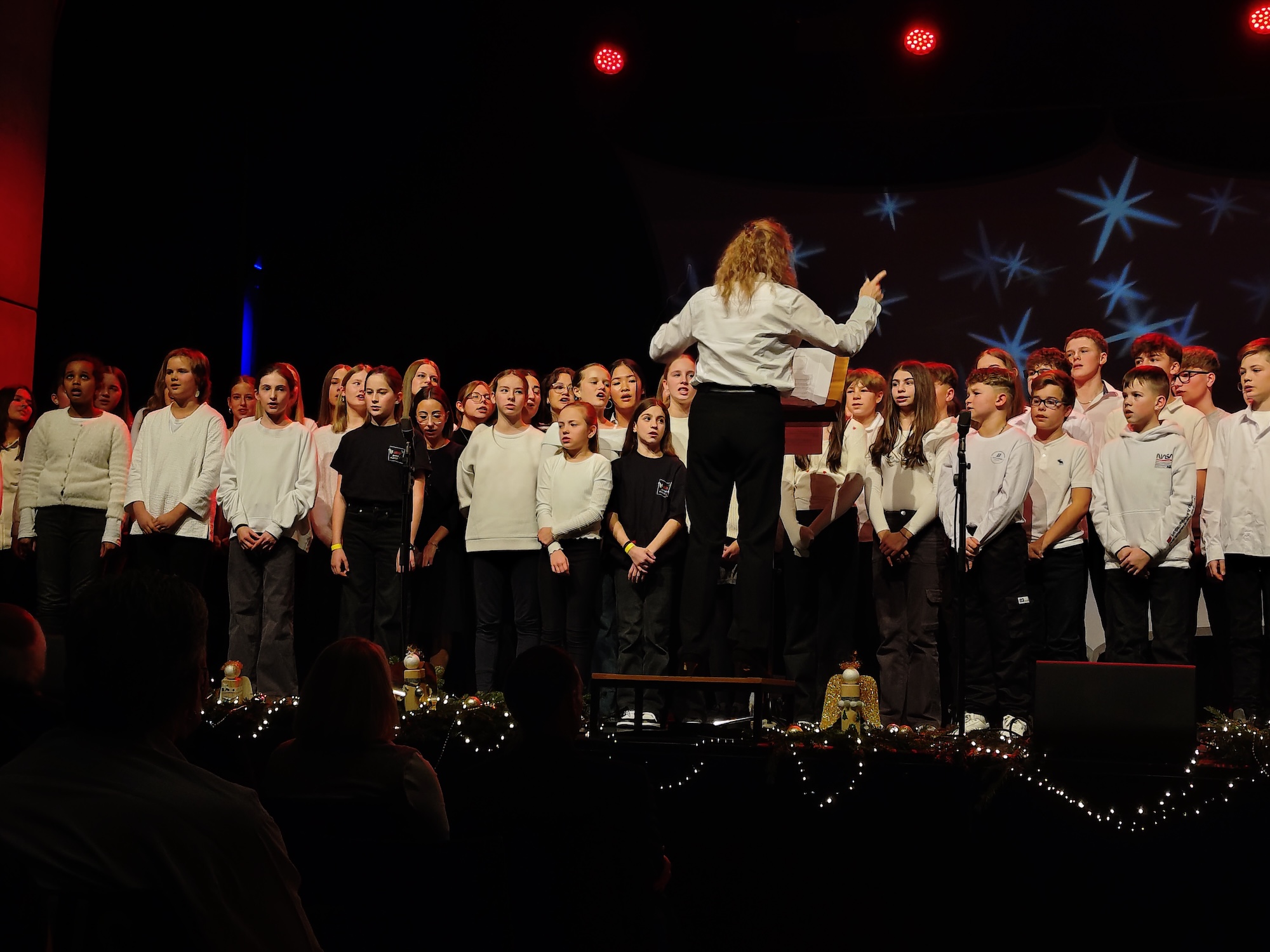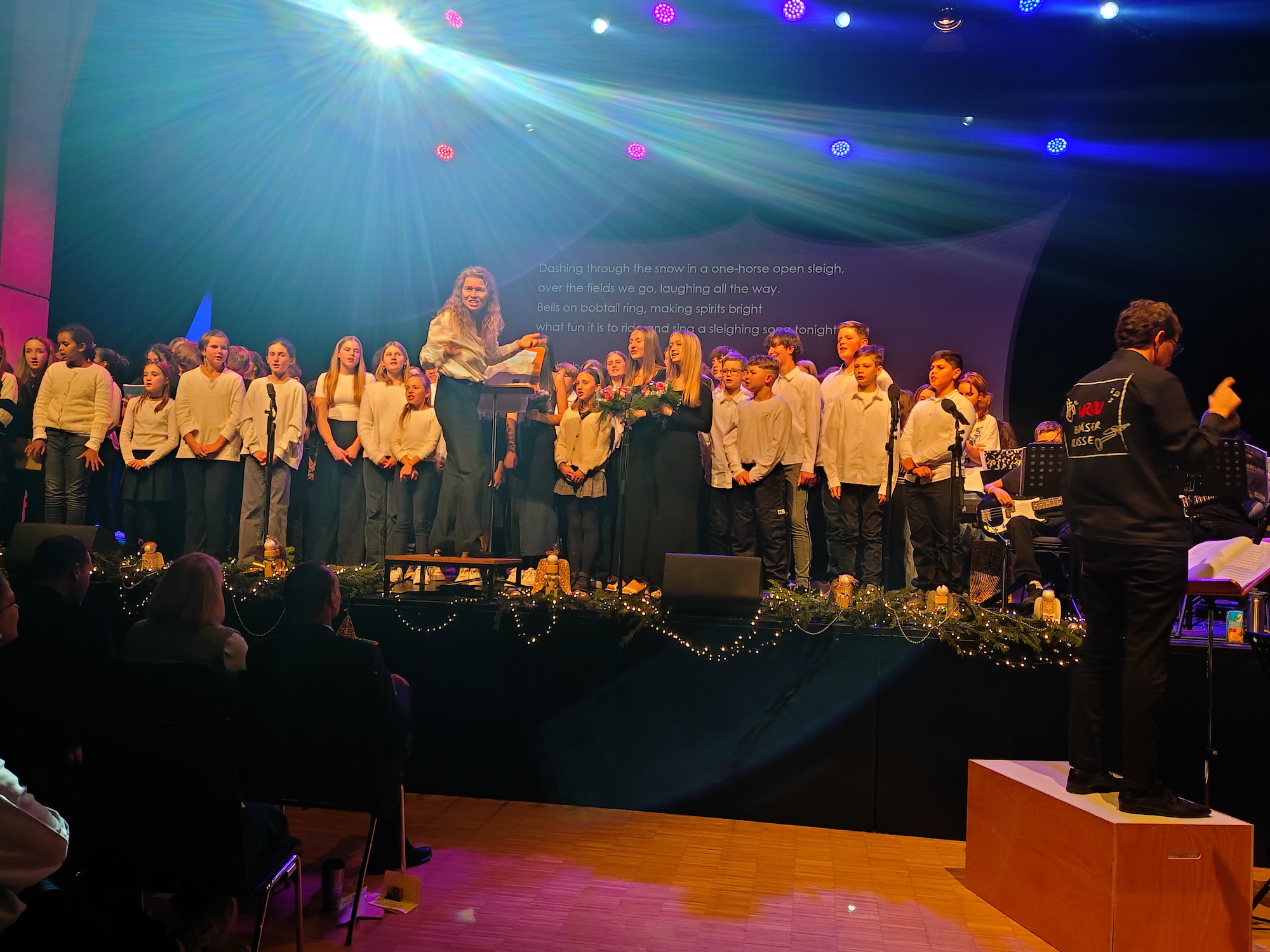 Einen gemütlichen Abschluss fand diese besondere Veranstaltung mit dem Lied „Jingle Bells“, bei dem alle beteiligten Schülerinnen und Schüler die Bühne betraten und das Lied unter Unterstützung des gesamten Publikums sangen.